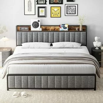 Amazon offers this Upholstered Full Size Bed Frame with Storage Shelf, Charging Station and Outlets for $49.99.
