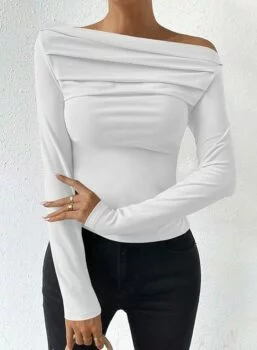 Womens Long Sleeve Boat Neck Off Shoulder Ruched Shirt